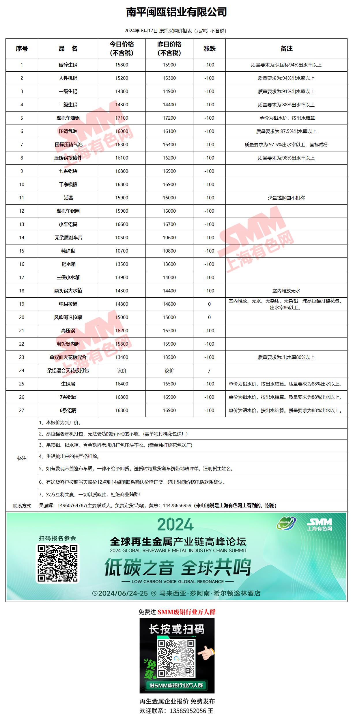 6月17日南平闽瓯 废铝采购报价