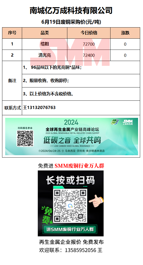 6月19日江西亿万成 废铜采购报价