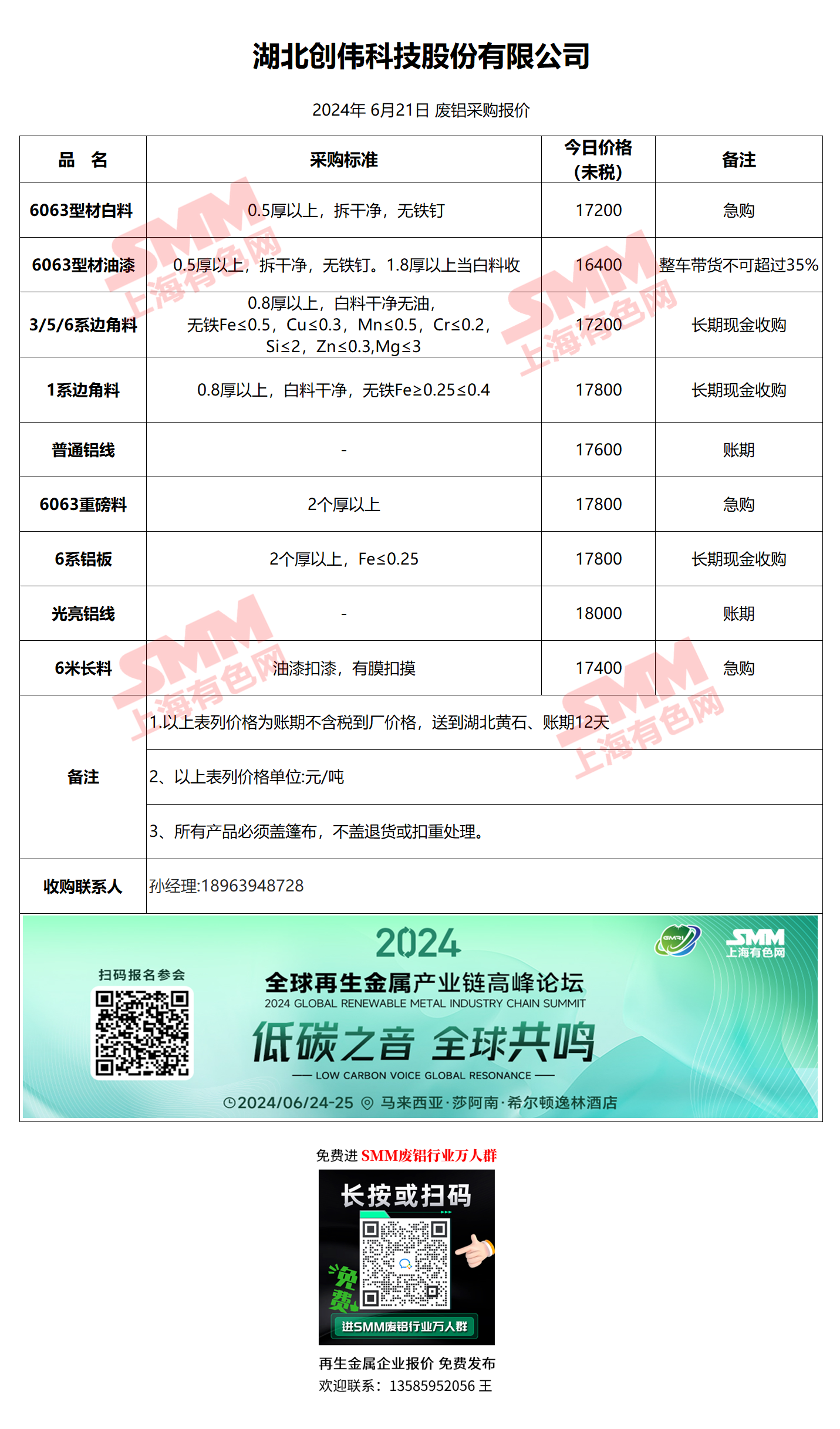 6月21日创伟科技 废铝采购报价