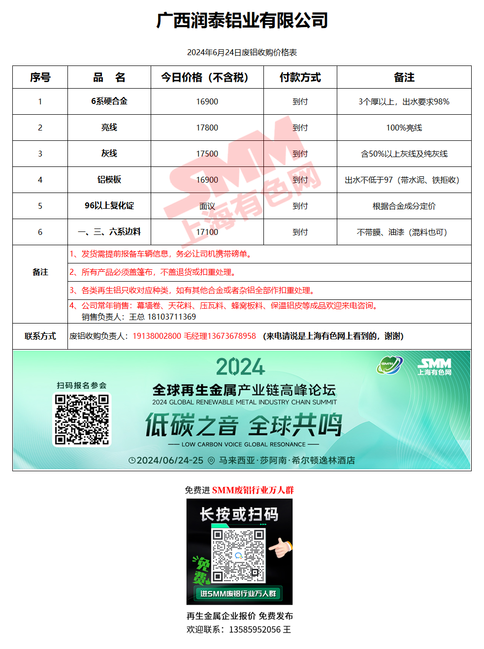 今日广西润泰铝业 废铝采购报价已更新,有货的朋友欢迎联系我们!
