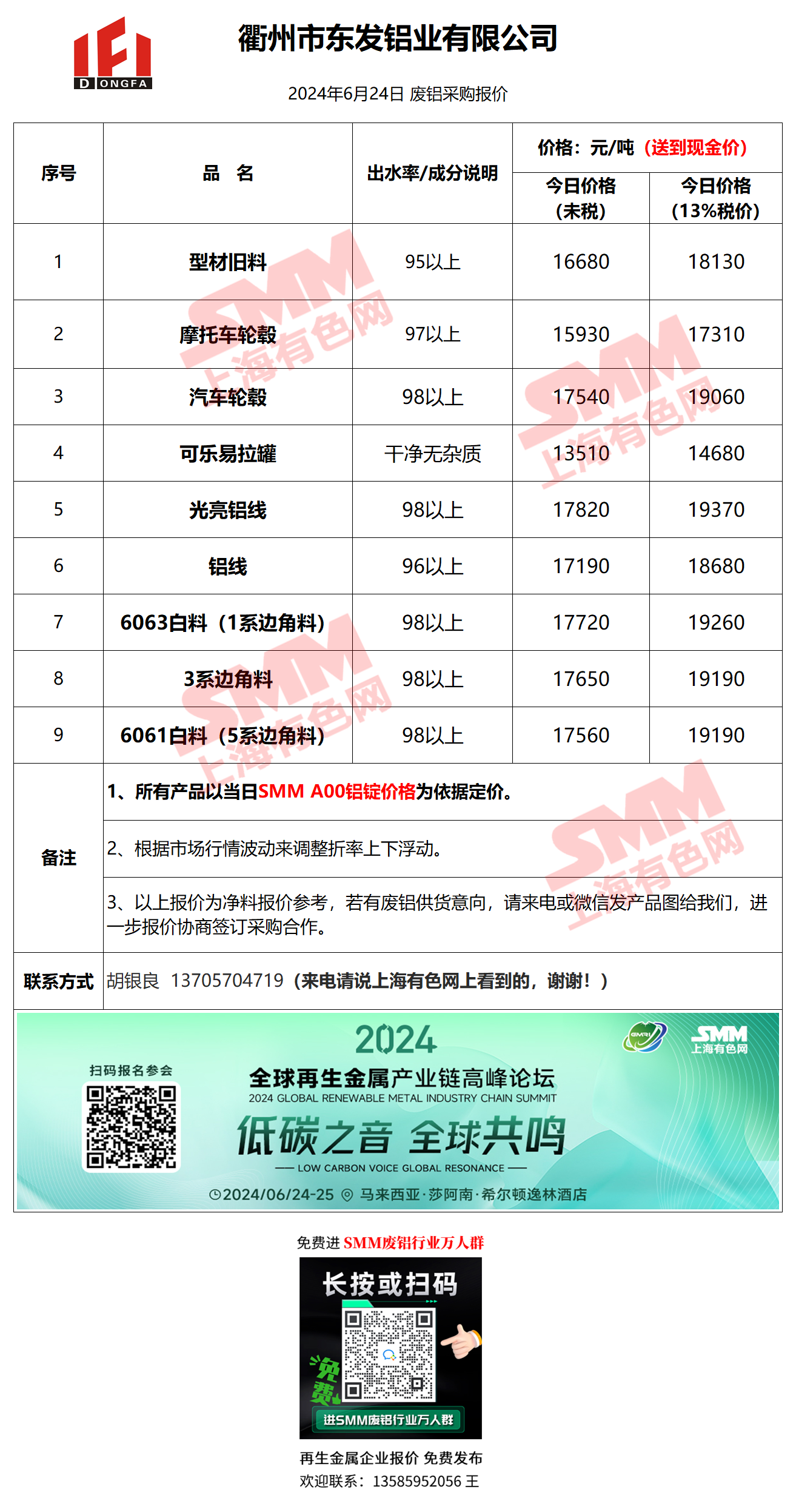 今日衢州东发 废铝采购报价已更新,有货的朋友欢迎联系我们!