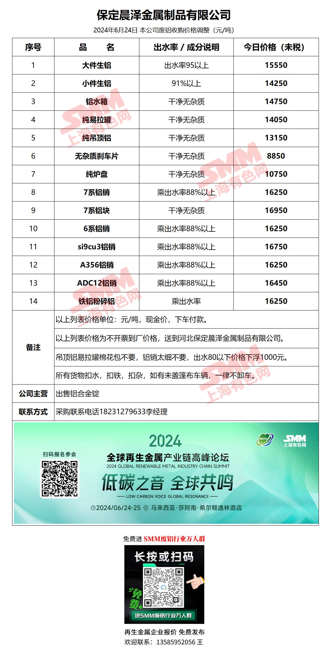 今日保定晨泽 废铝采购报价已更新,有货的朋友欢迎联系我们!