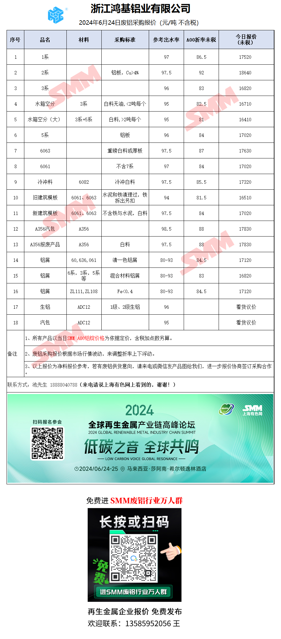 今日浙江鸿基铝业 废铝采购报价已更新,有货的朋友欢迎联系我们!
