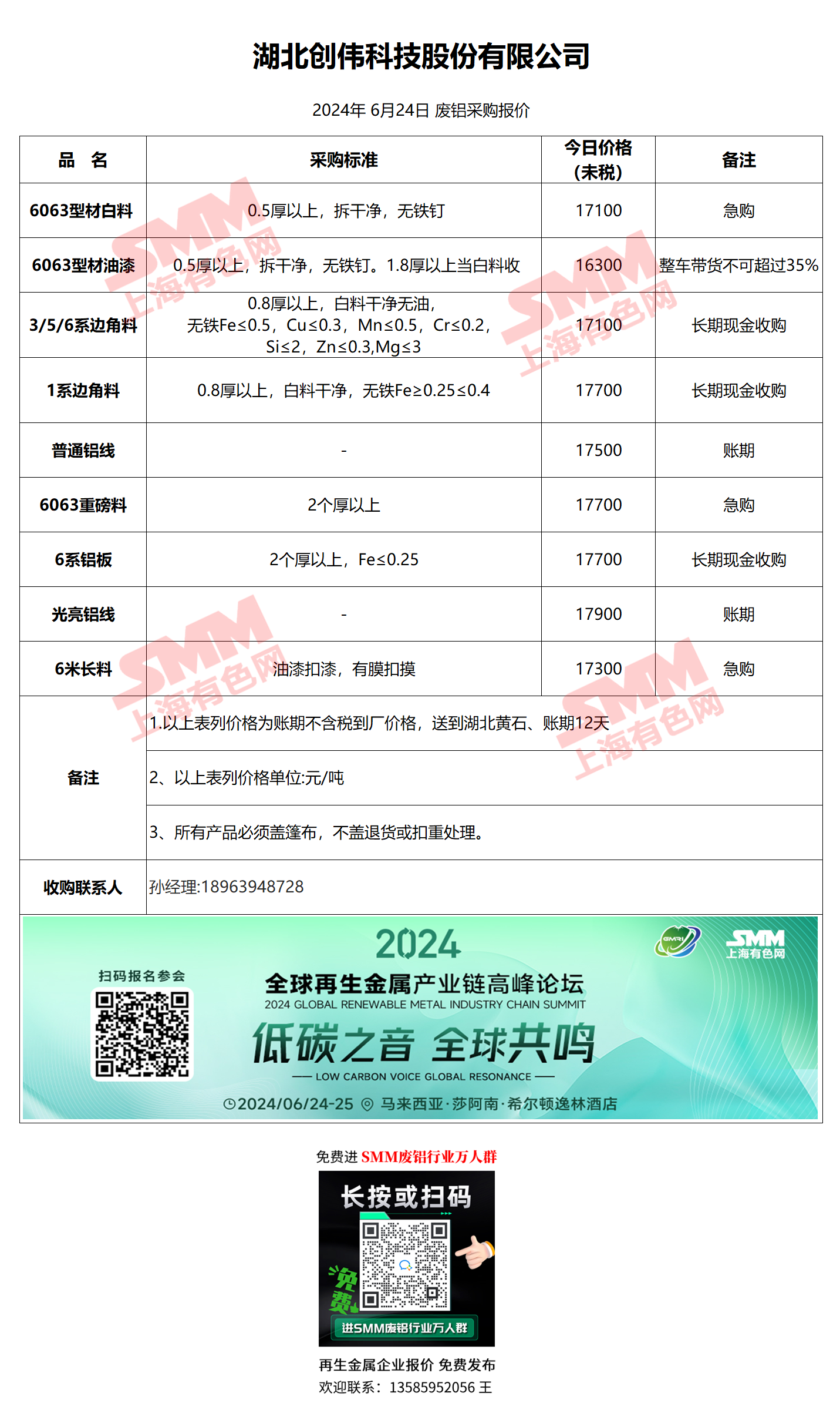 6月24日创伟科技 废铝采购报价