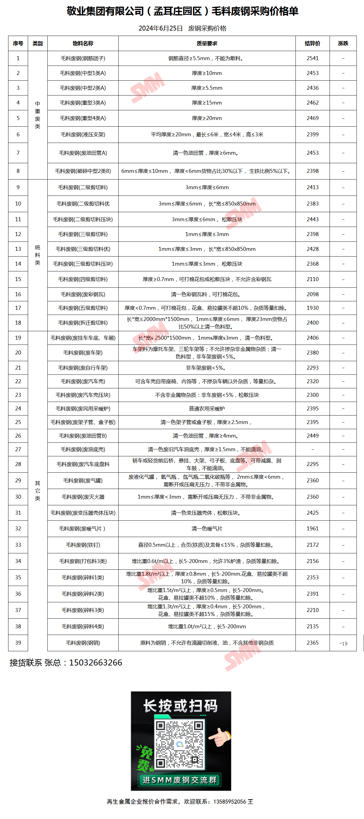 6月25日敬业钢铁(孟耳庄园区) 废钢采购报价