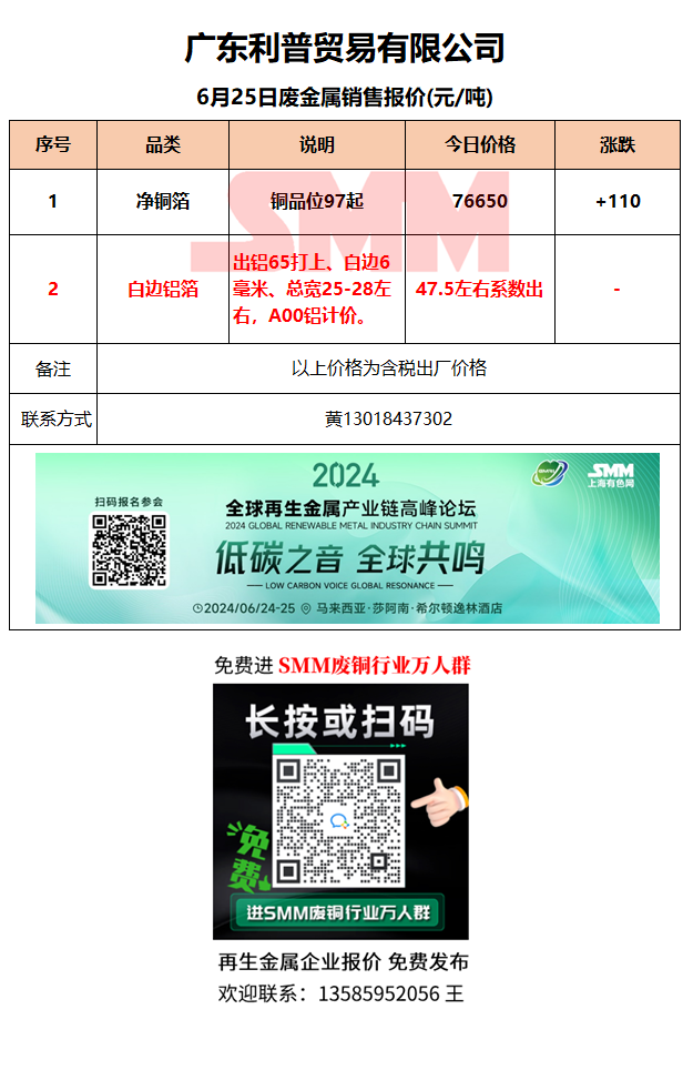 6月25日广东利普 废铜废铝销售报价