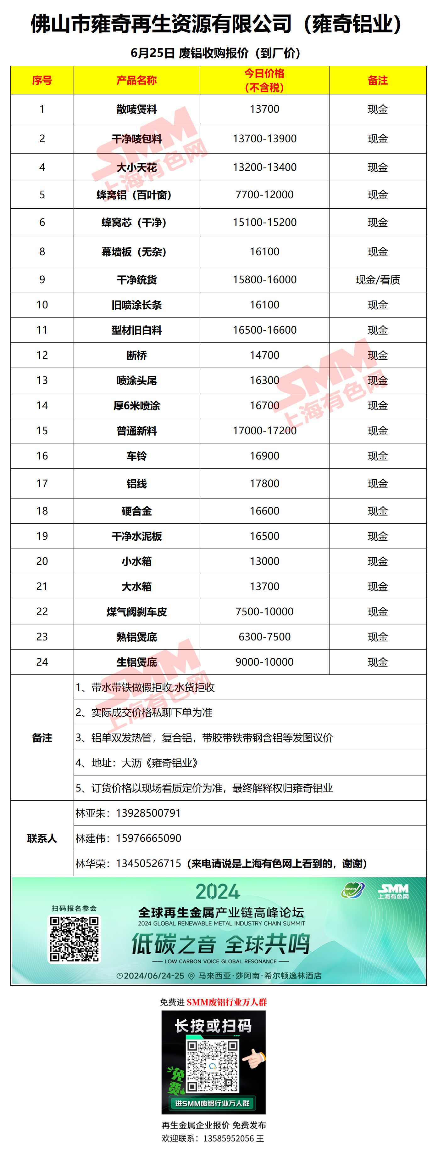6月25日佛山雍奇 废铝采购报价
