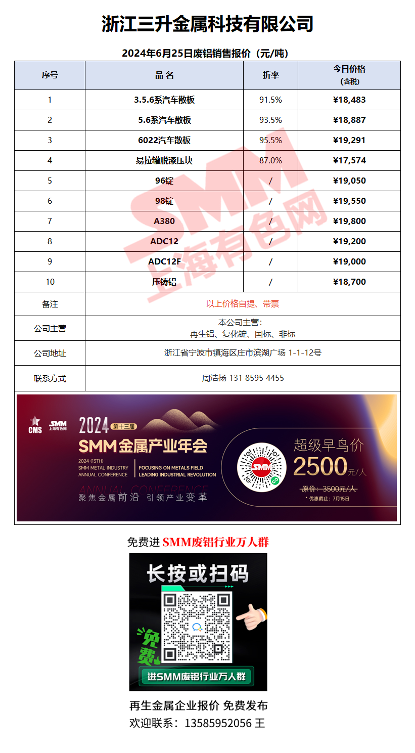 6月25日浙江三升 废铝销售报价
