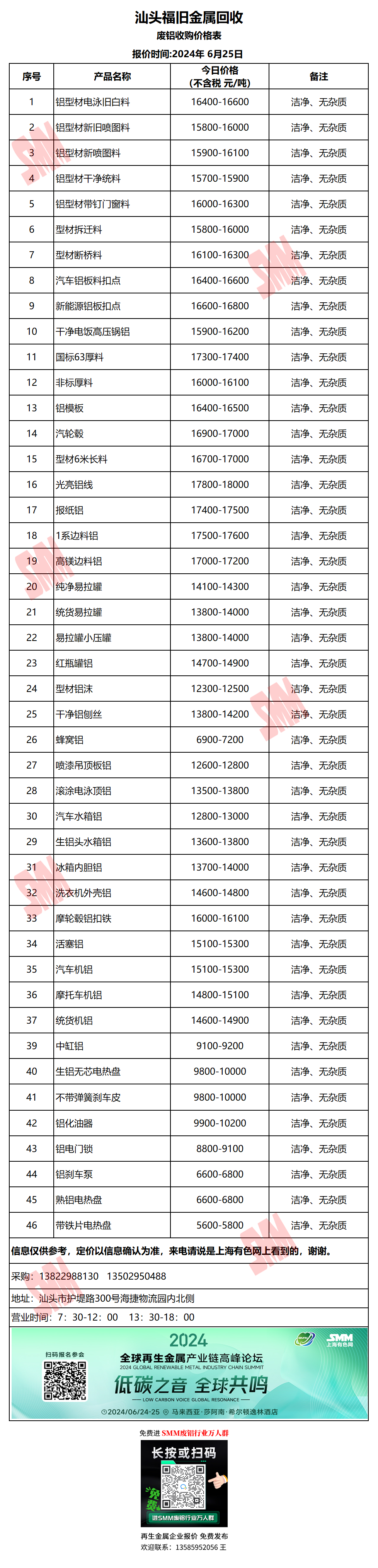 6月25日汕头福旧 废铝采购报价