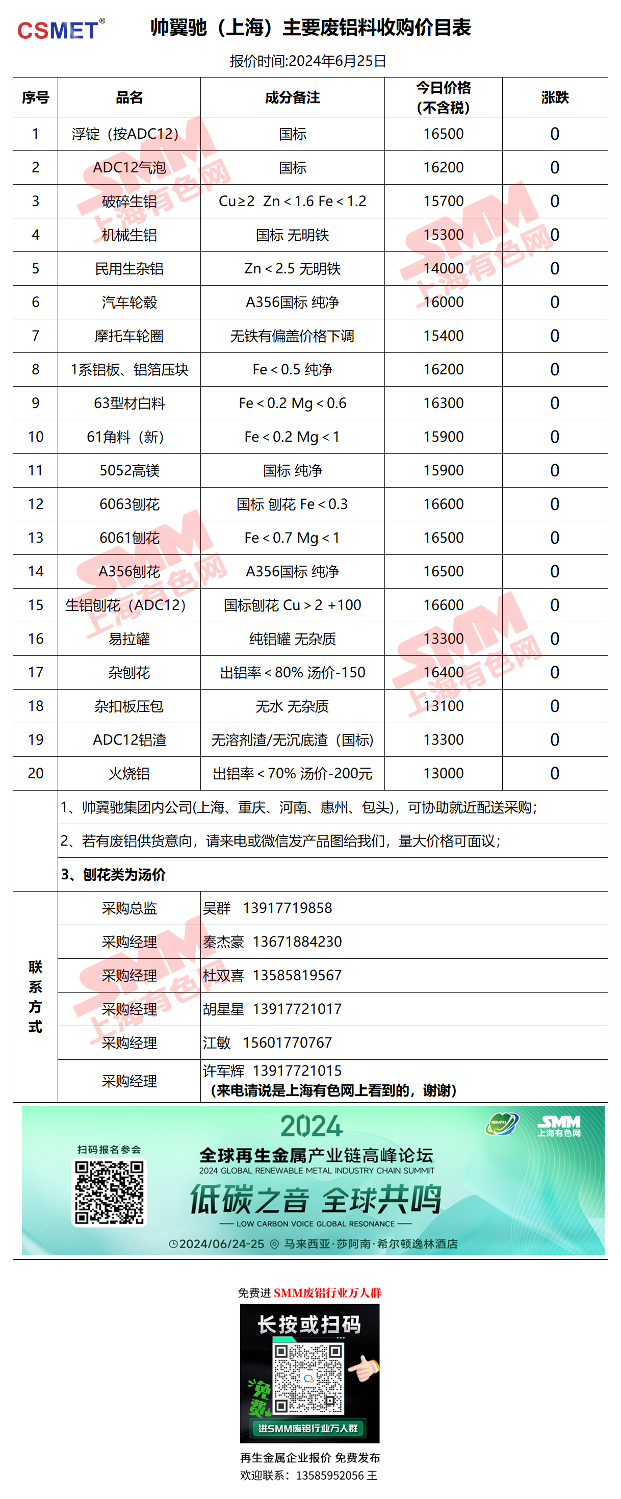 6月25日帅翼驰(上海) 废铝采购报价