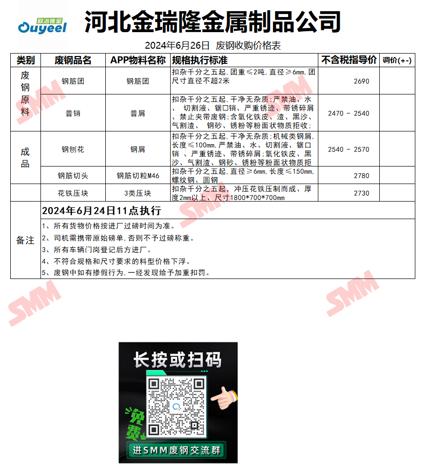 6月26日河北金瑞隆钢铁 废钢收购报价