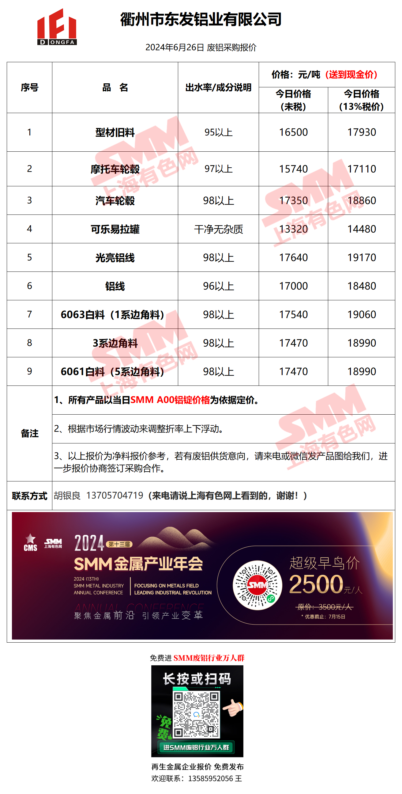 6月26日衢州东发 废铝采购报价