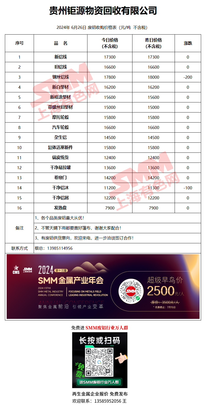 今日贵州钜源 废铝采购报价已更新,有货的朋友欢迎联系我们!