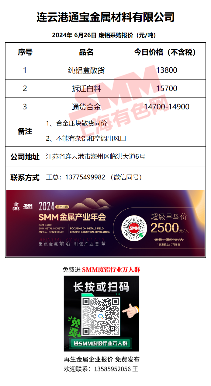 6月26日连云港通宝 废铝采购报价