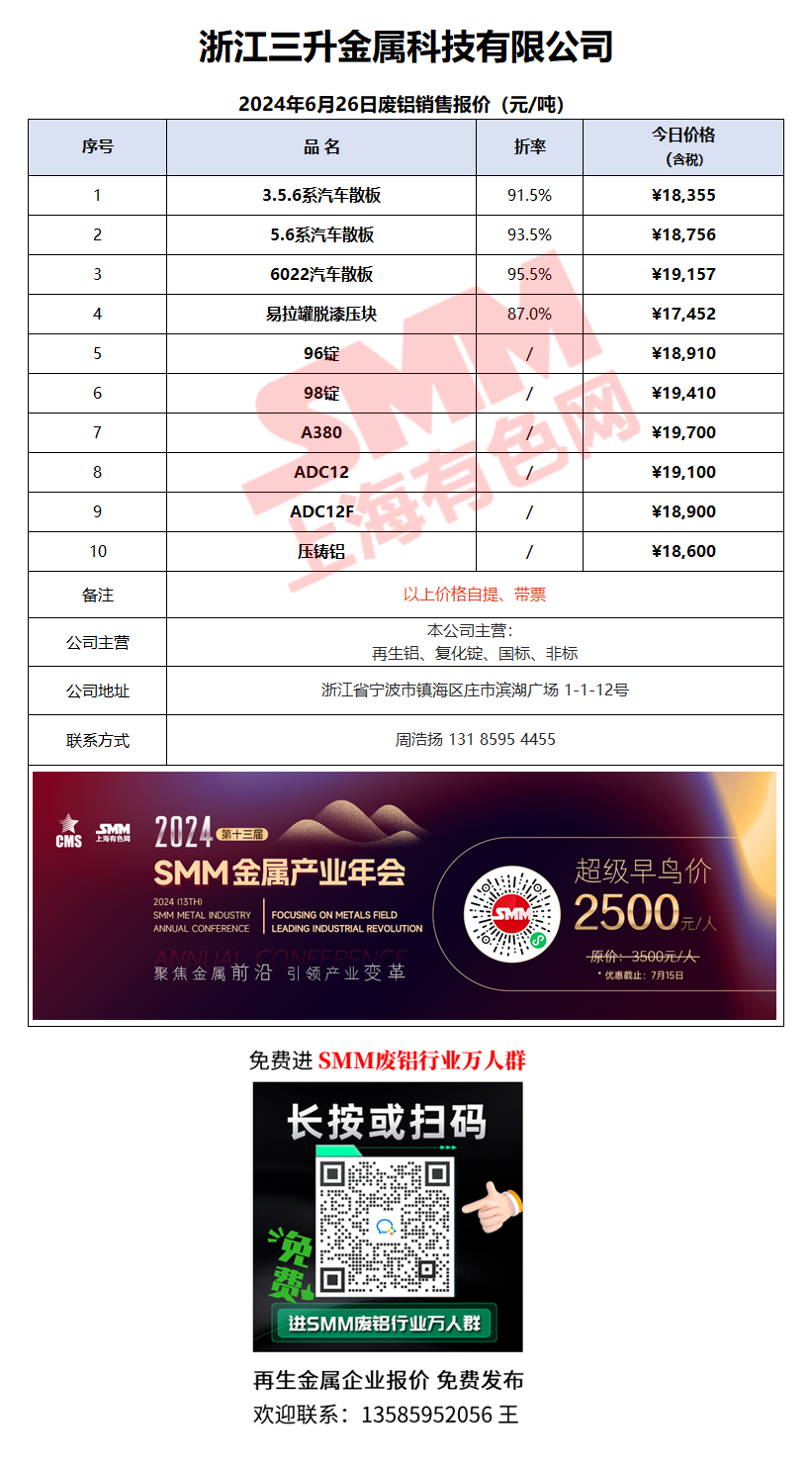 6月26日浙江三升 废铝销售报价