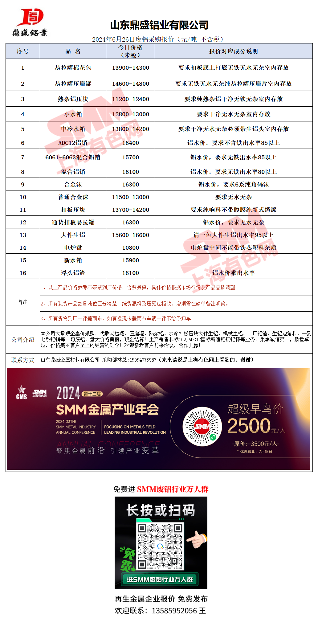 今日山东鼎盛 废铝采购报价已更新,有货的朋友欢迎联系我们!