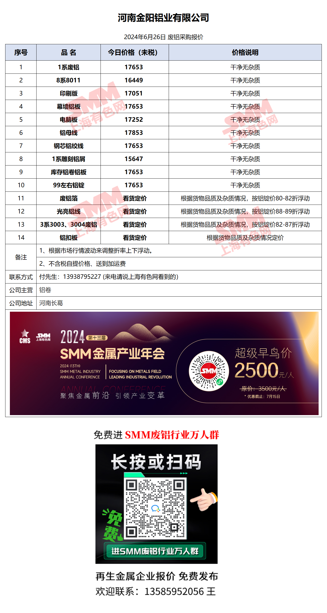 6月26日河南金阳铝业 废铝采购报价