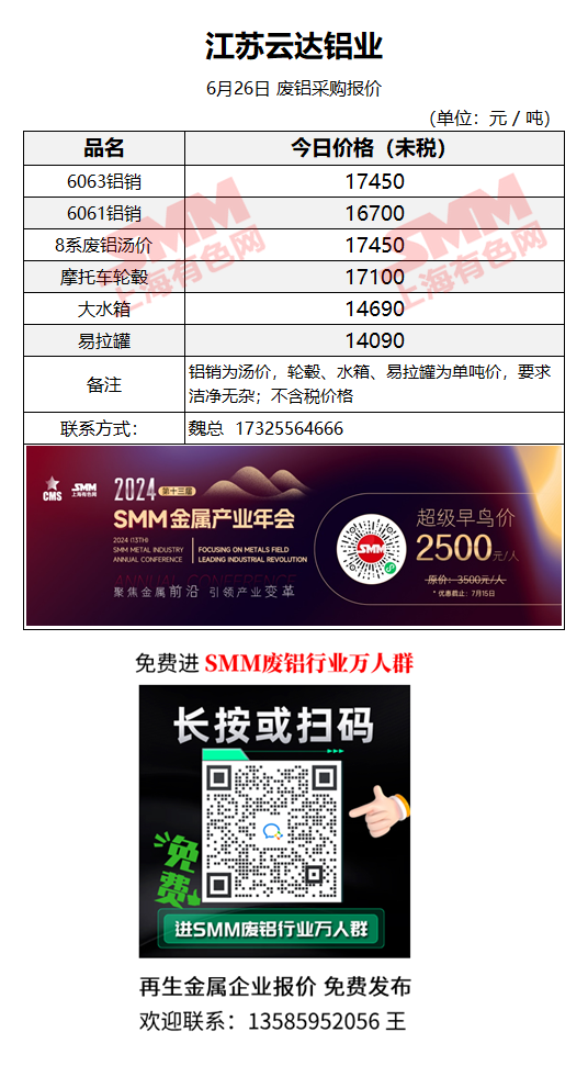 今日江苏云达铝业 废铝采购报价已更新,有货的朋友欢迎联系我们!