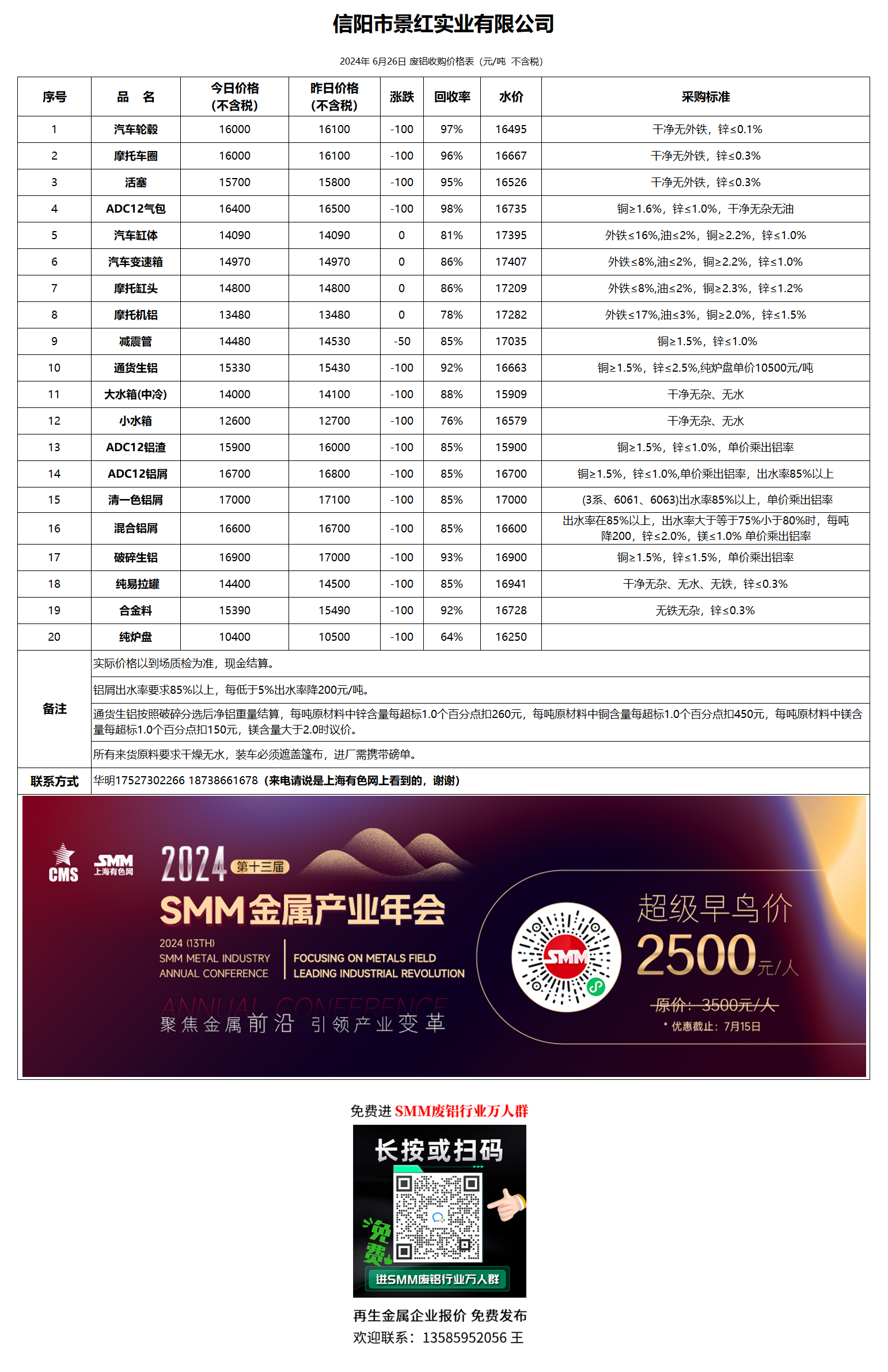 今日河南景红 废铝采购报价已更新,有货的朋友欢迎联系我们!