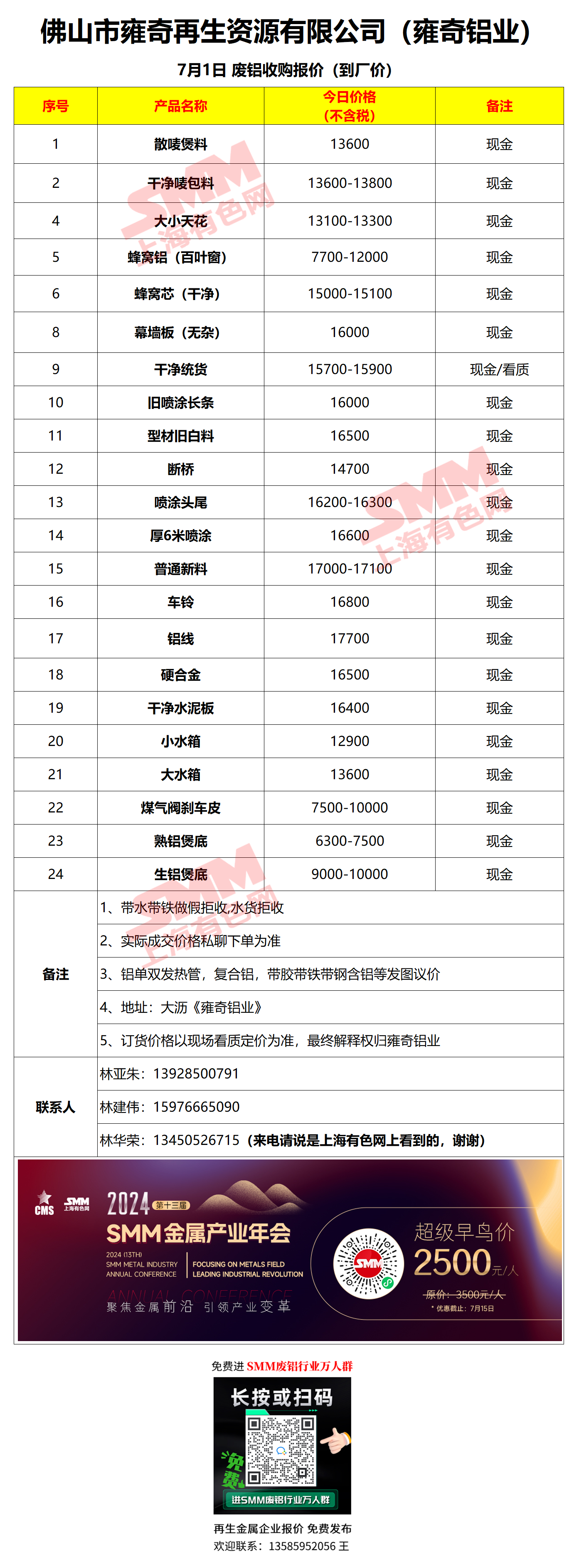 7月1日佛山雍奇 废铝采购报价
