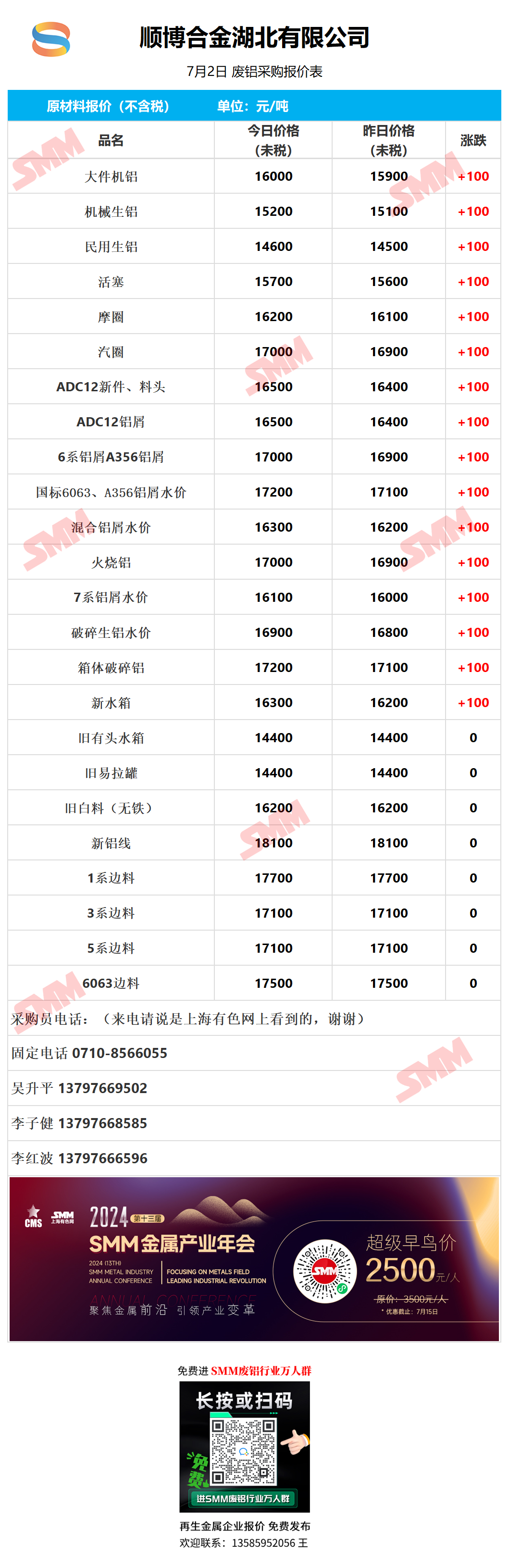 7月2日顺博合金湖北 废铝采购报价