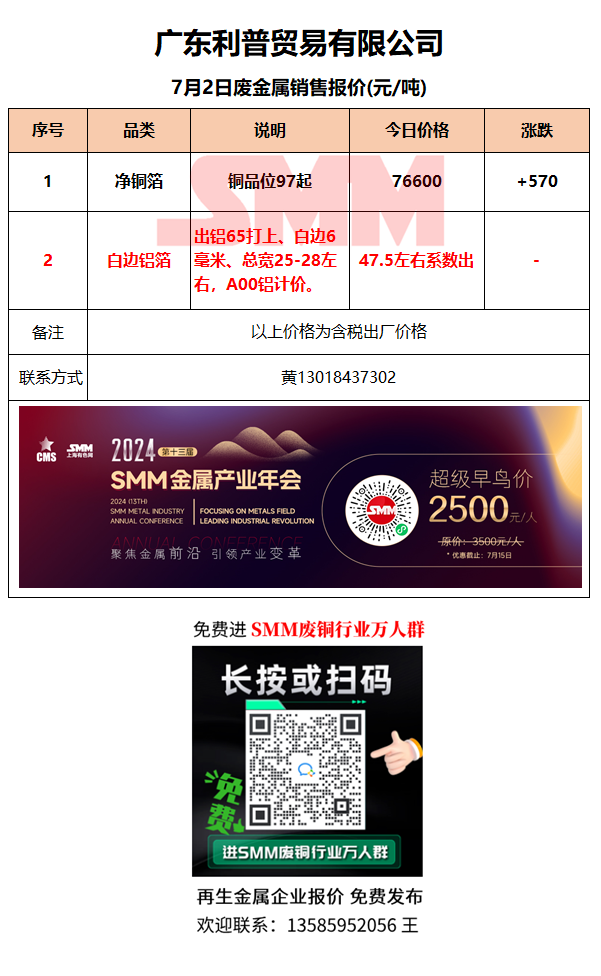 7月2日广东利普 废铜废铝销售报价