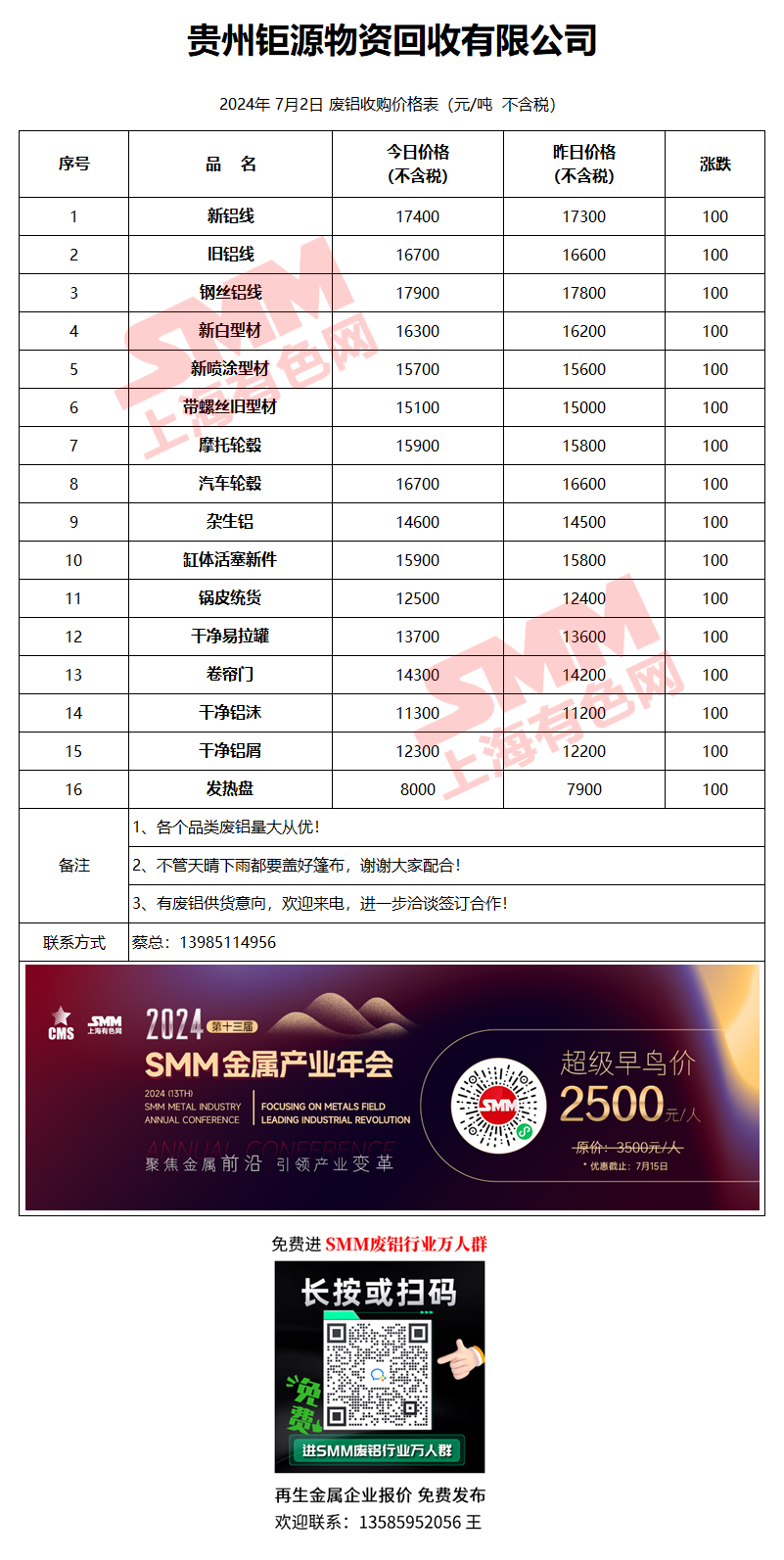 今日贵州钜源 废铝采购报价已更新,有货的朋友欢迎联系我们!