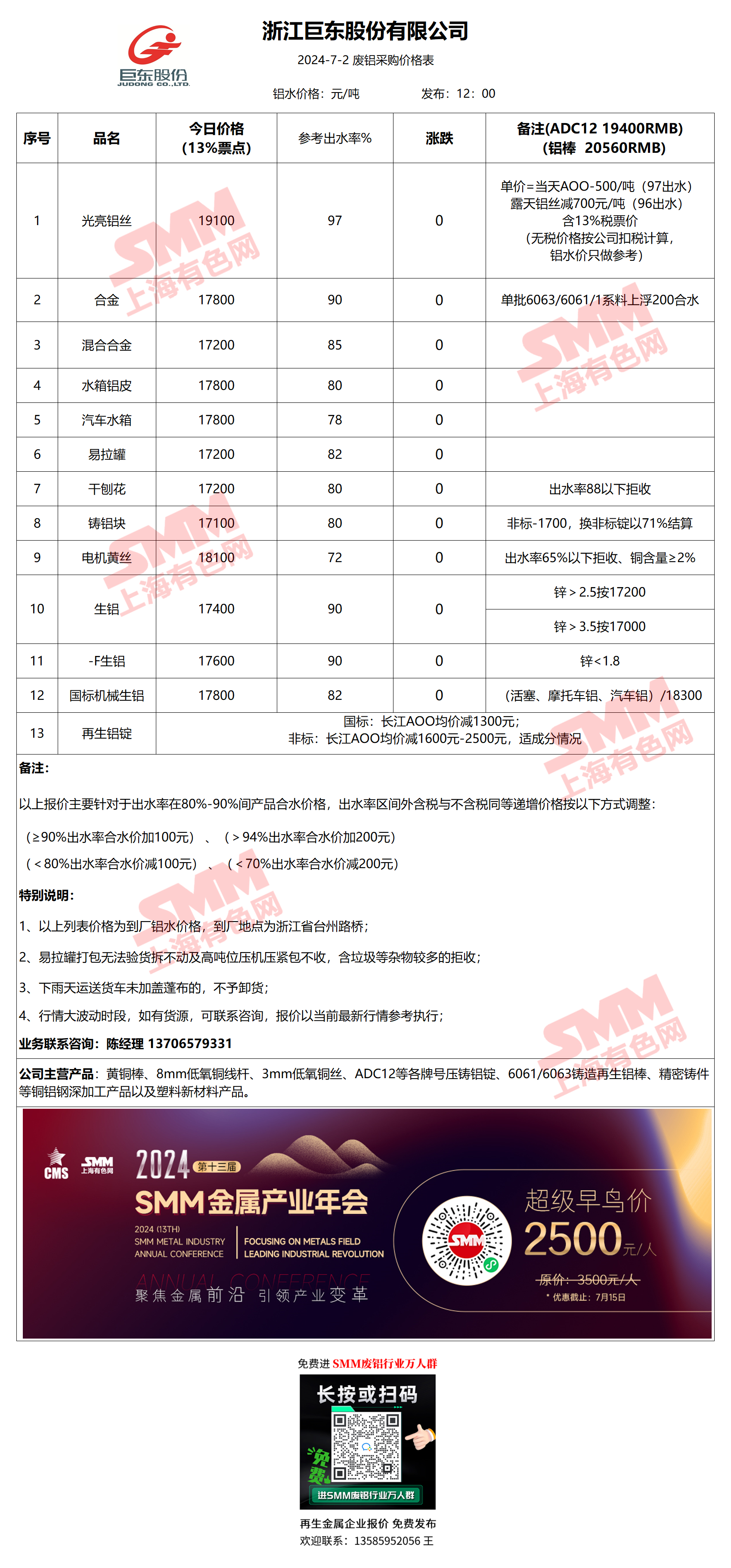 今日浙江巨东 废铝采购报价已更新,有货的朋友欢迎联系我们!