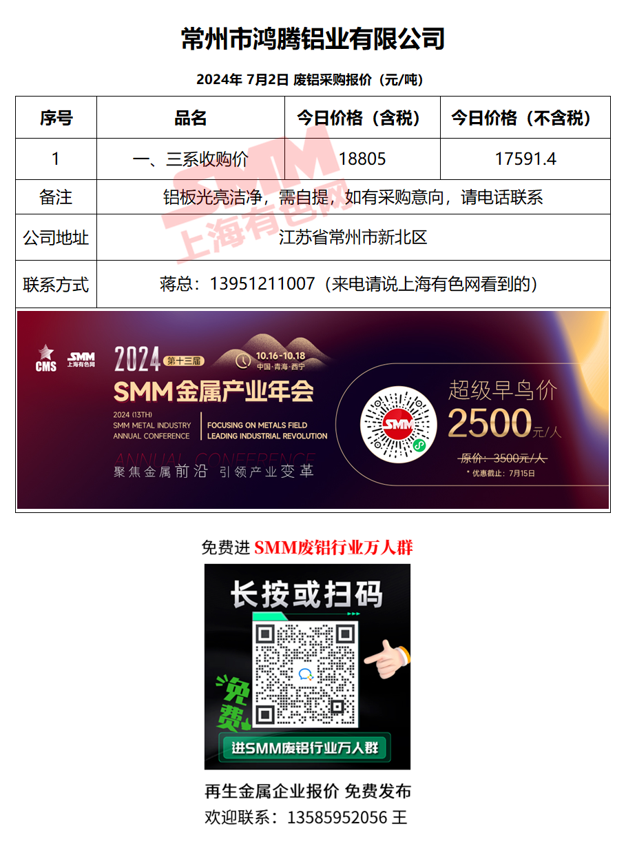 7月2日鸿腾铝业 废铝采购报价