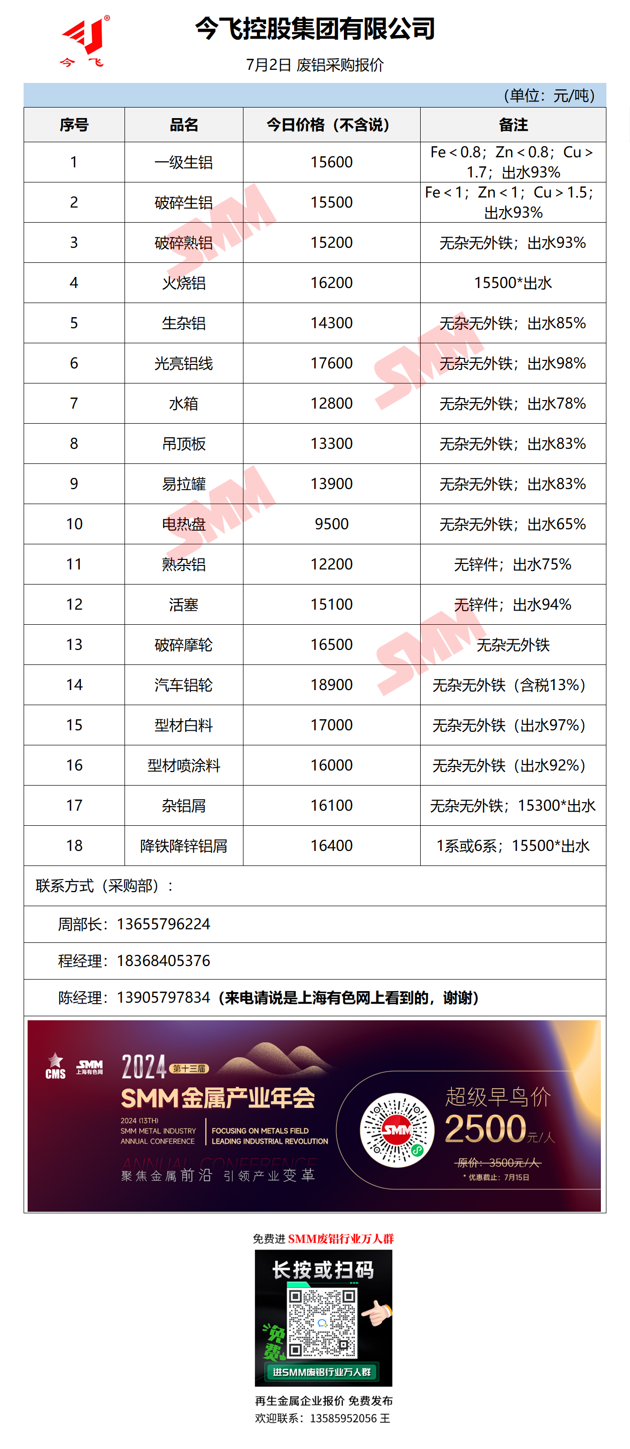 7月2日今飞集团 废铝采购报价