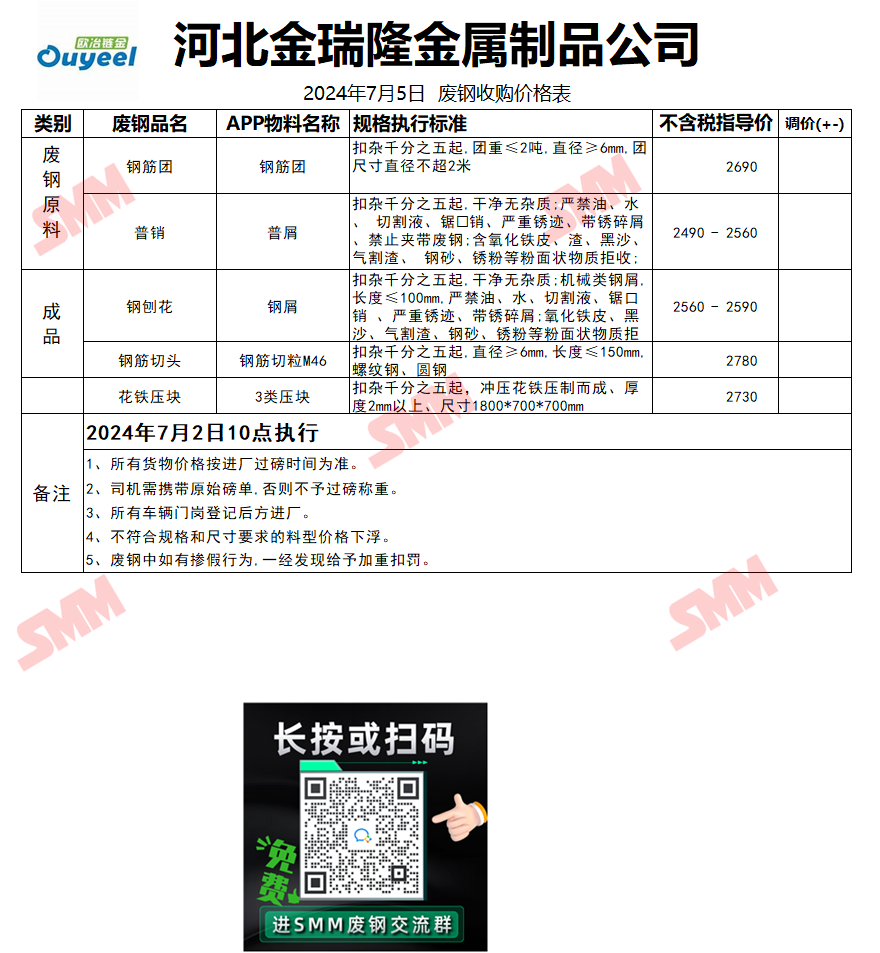 7月5日河北金瑞隆钢铁 废钢收购报价