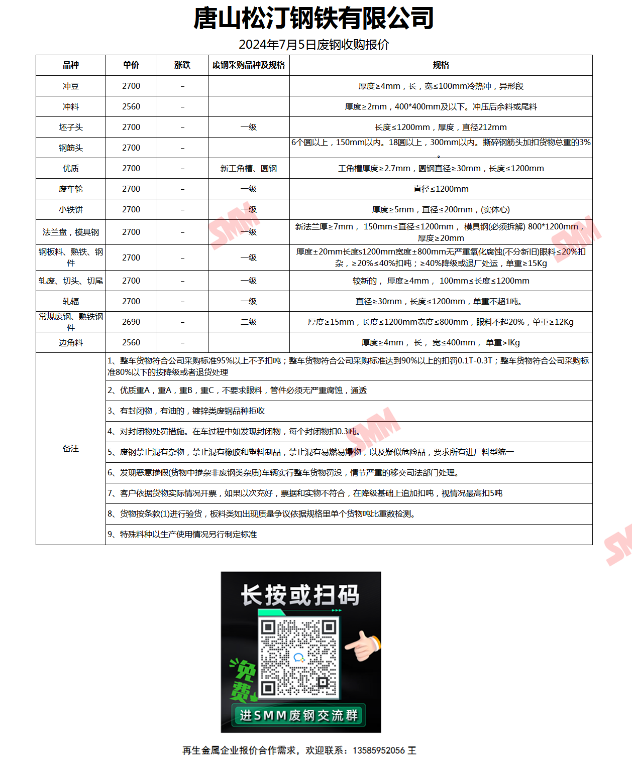 今日唐山松汀钢铁 废钢收购报价已更新,有货的朋友欢迎联系我们!
