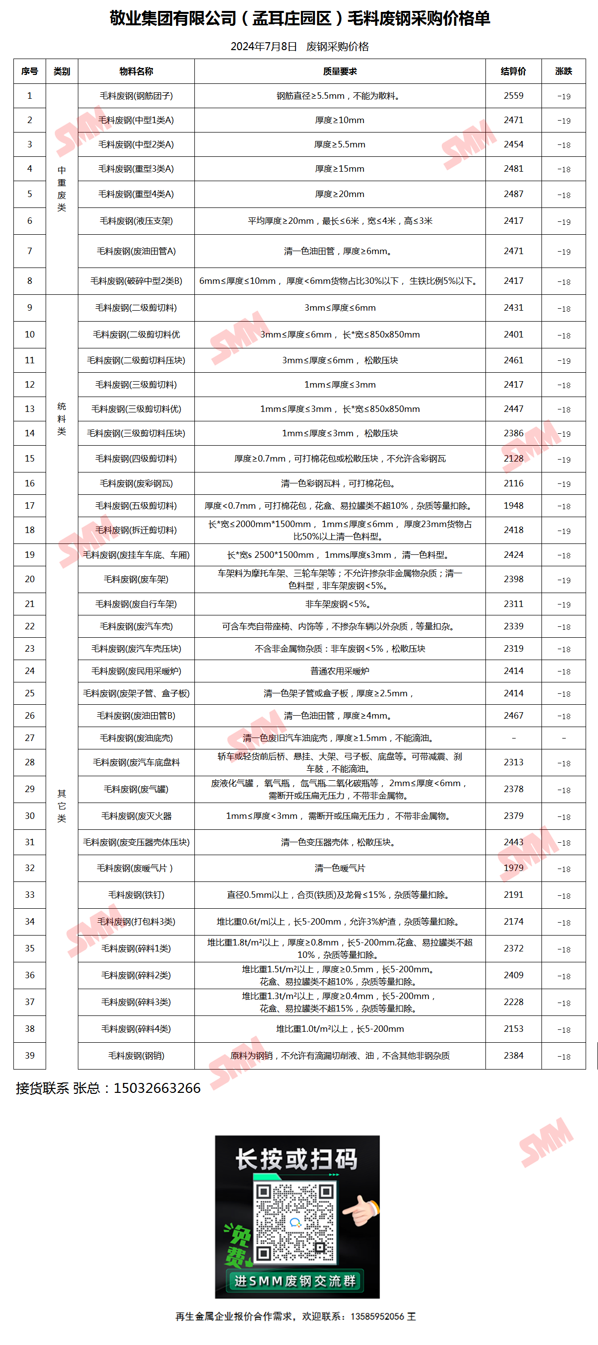 7月8日 敬业钢铁(孟耳庄园区) 废钢采购报价