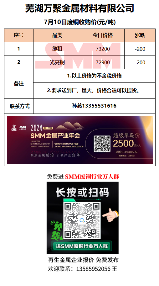 今日芜湖万聚金属 废铜采购报价已更新,有货的朋友欢迎联系我们!