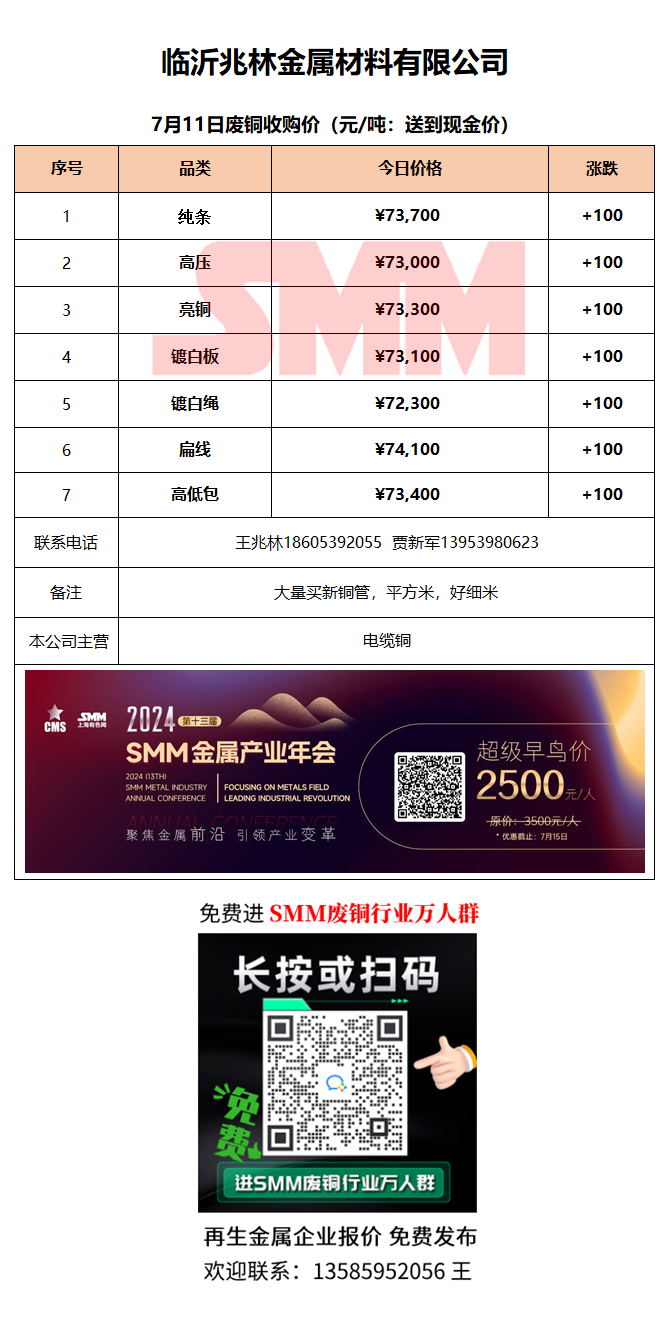 7月11日临沂兆林金属 废铜采购报价