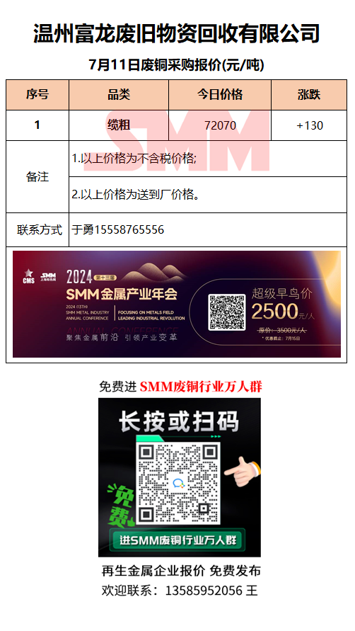 7月11日温州富龙废旧 废铜采购报价