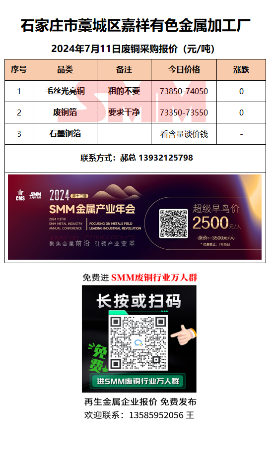 今日嘉祥有色金属 废铜采购报价已更新,有货的朋友欢迎联系我们!