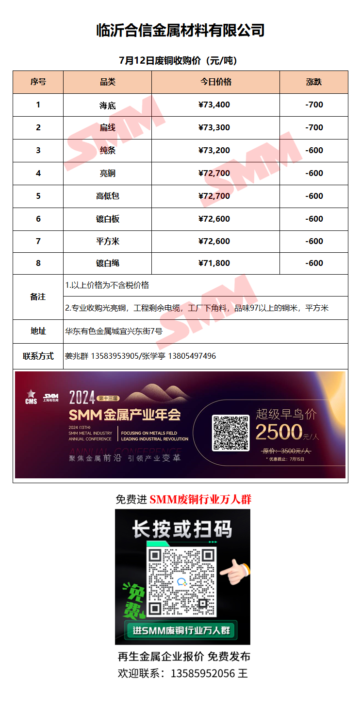 7月12日临沂合信金属 废铜采购报价