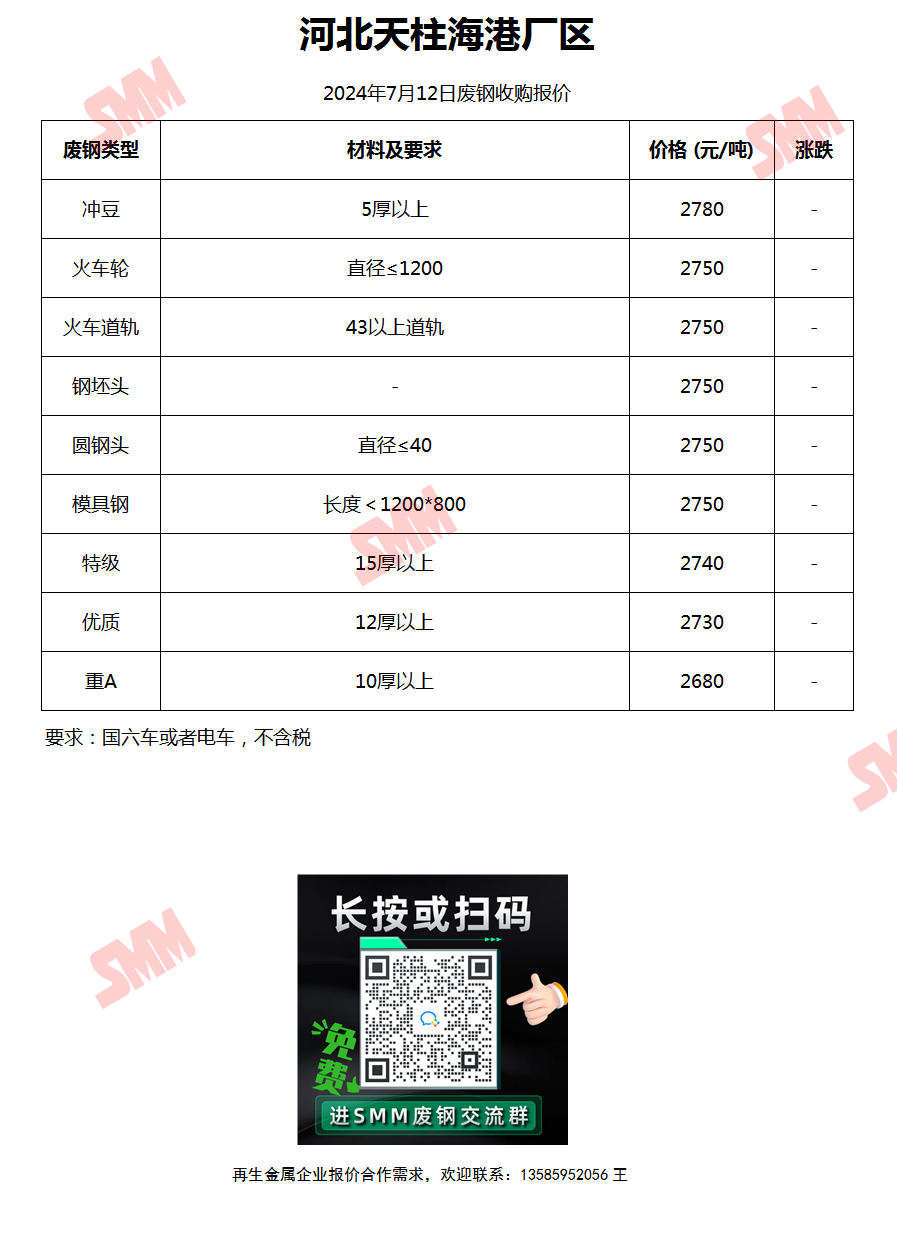 7月12日 河北天柱海港厂区 废钢收购报价