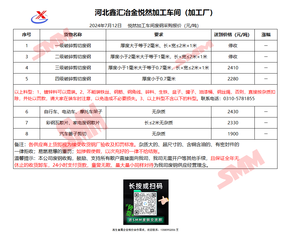 7月12日河北鑫汇冶金悦然加工车间 废钢采购报价