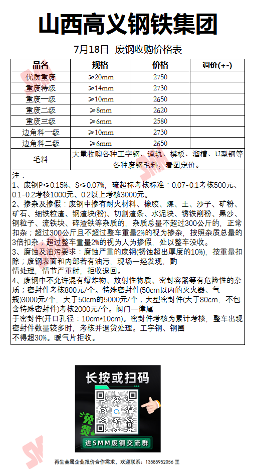 今日山西高义 废钢收购报价已更新,有货的朋友欢迎联系我们!