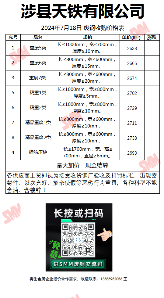今日涉县天铁 废钢收购报价已更新,有货的朋友欢迎联系我们!