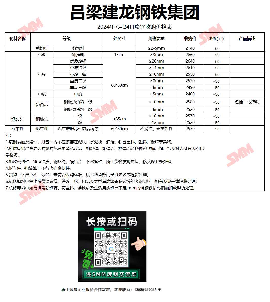 7月24日吕梁建龙钢铁 废钢收购报价