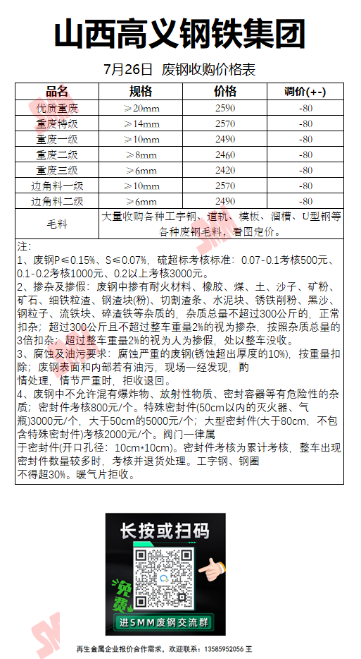 今日山西高义 废钢收购报价已更新,有货的朋友欢迎联系我们!