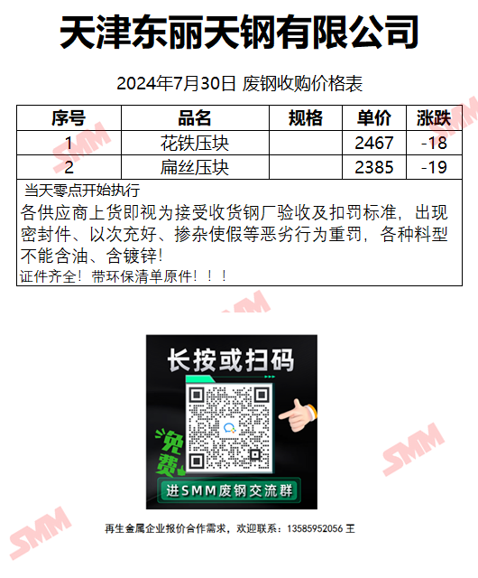 7月30日天津东丽天钢 废钢收购报价