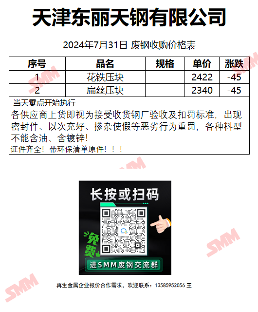 7月31日天津东丽天钢 废钢收购报价