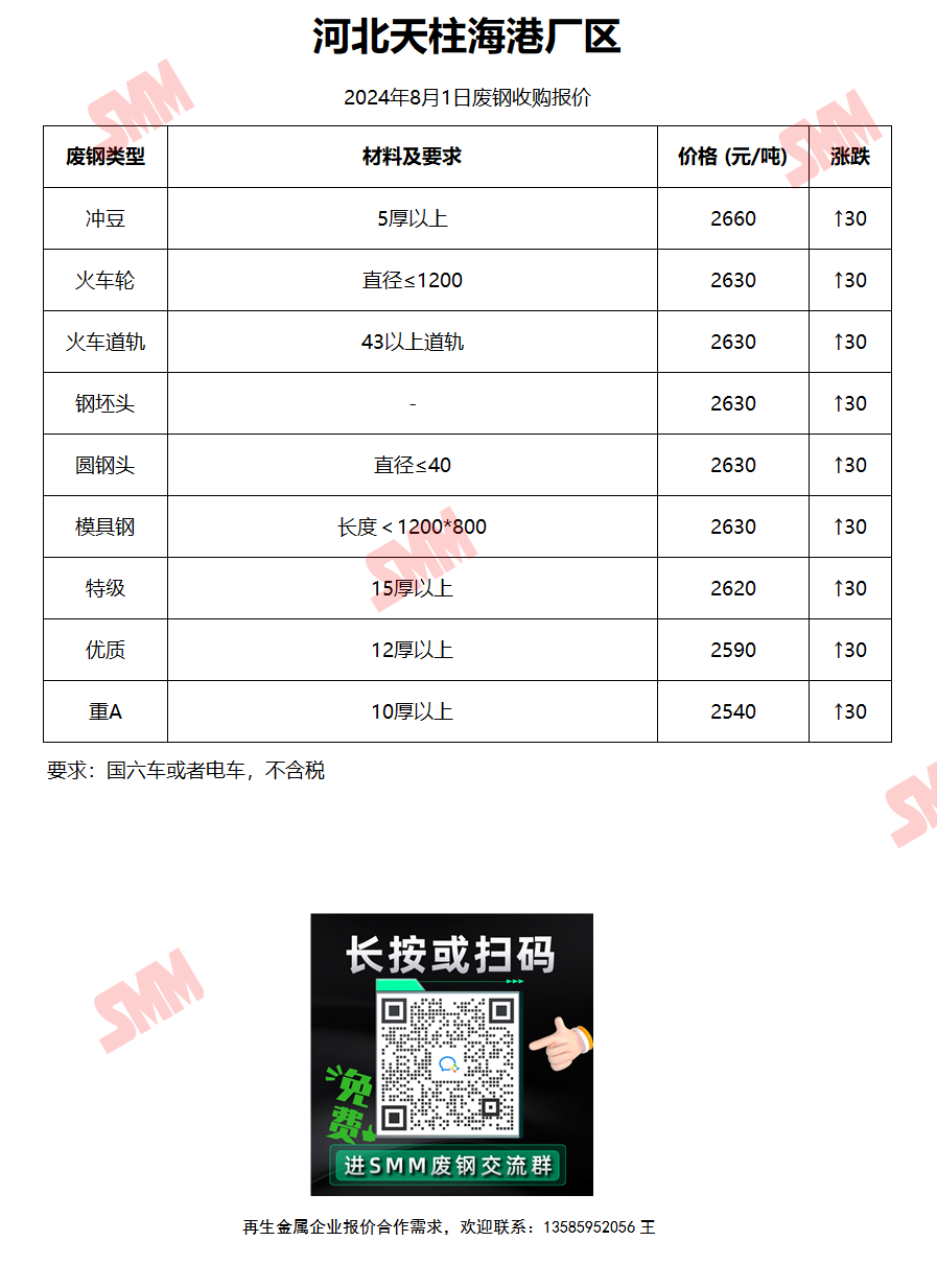 8月1日 河北天柱海港厂区 废钢收购报价