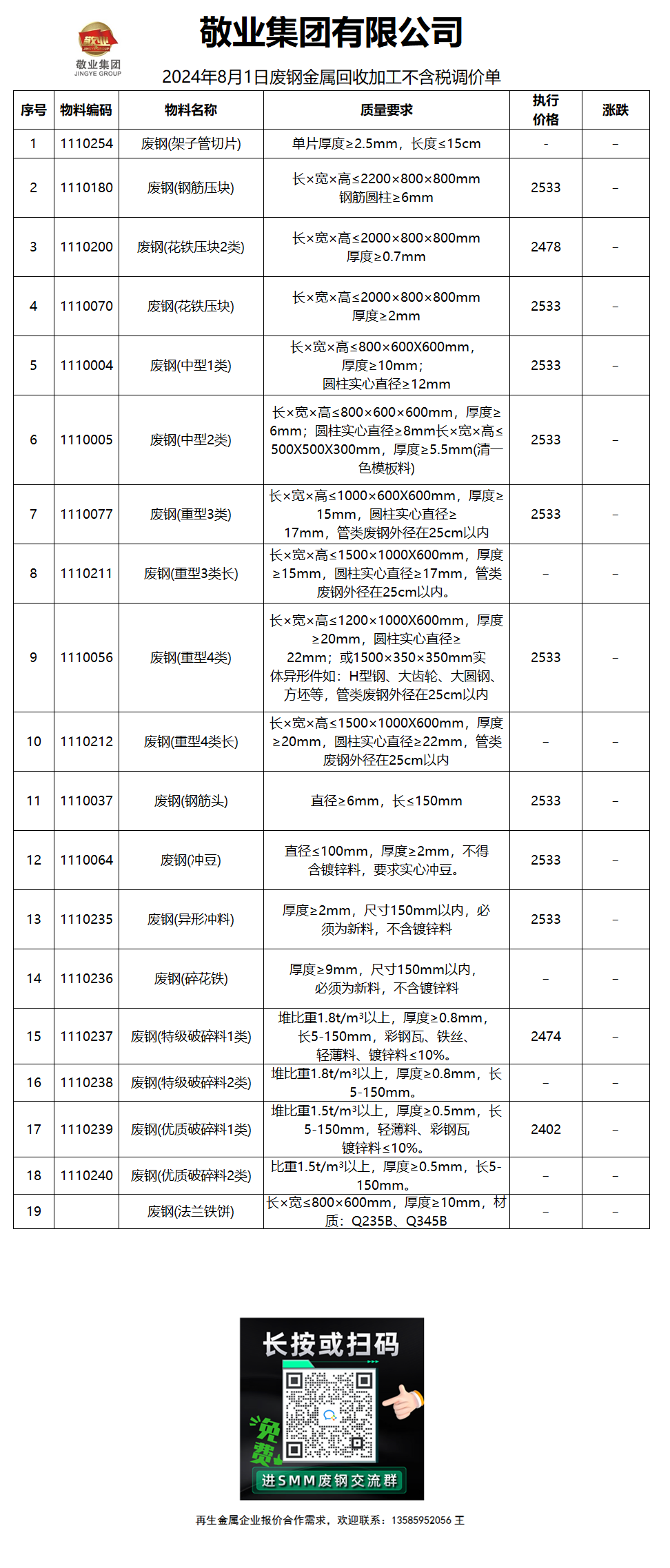 今日敬业钢铁本部 废钢采购报价已更新,有货的朋友欢迎联系我们!