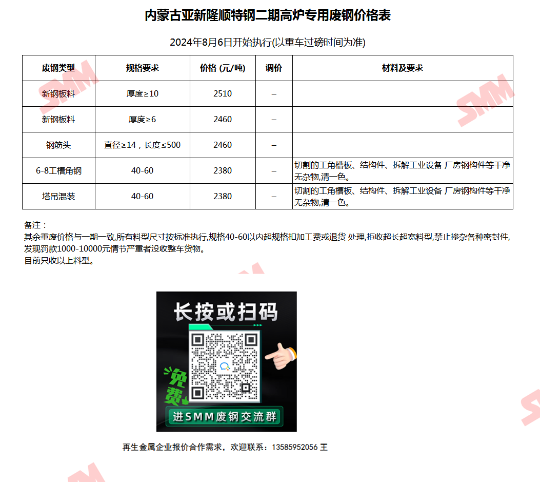 8月6日内蒙古亚新隆顺特钢二期 废钢收购报价
