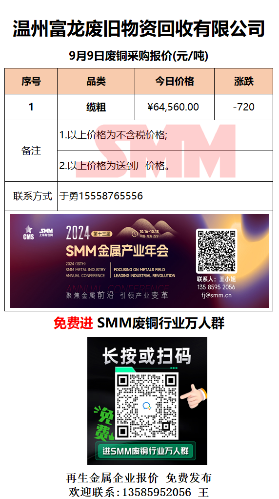 9月9日温州富龙废旧 废铜采购报价